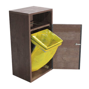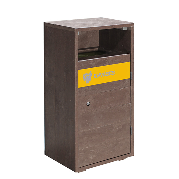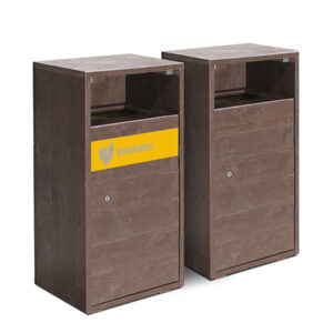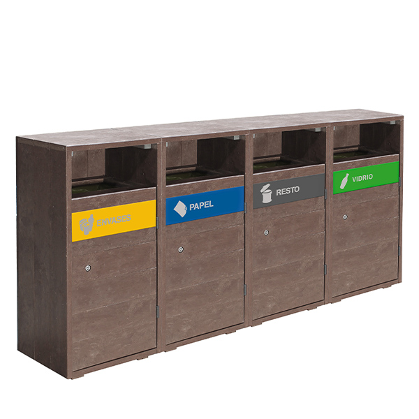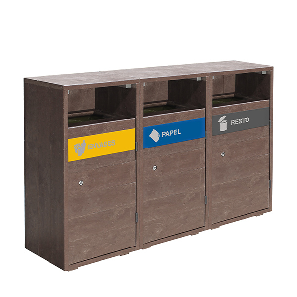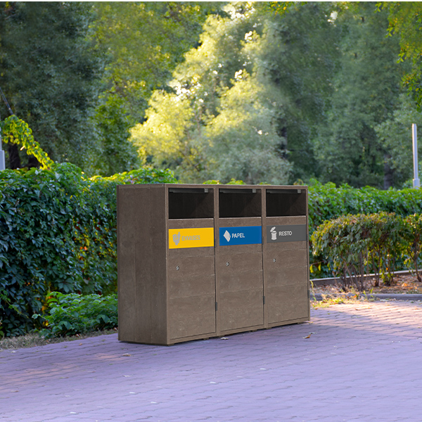 Poubelle modulaire de tri sélectif alliant résistance et matériaux recyclés qui se fondera parfaitement dans le décor des parcs touristiques.